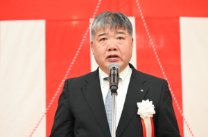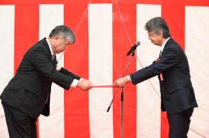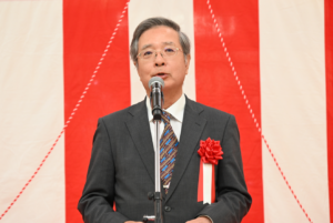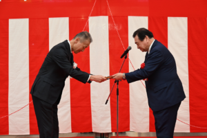 式典では、佐伯会長の挨拶に続いて、尾藤選考委員長により選考経過の紹介が行われました。その後、表彰状が佐伯会長から近畿日本鉄道株式会社 代表取締役社長 原 恭様へ、記念盾が最明副会長から近畿日本鉄道株式会社 常務執行役員 福嶌 博様に手渡されました。その後、近畿日本鉄道株式会社 代表取締役社長 原 恭様による受賞者ご挨拶、受賞関係者全員による記念撮影、受賞関係者全員でのくす玉開披を行い、式典は滞りなく終了しました。