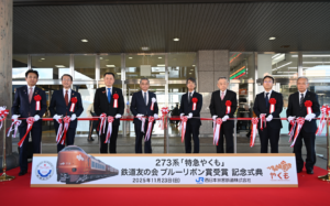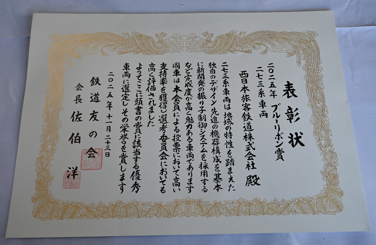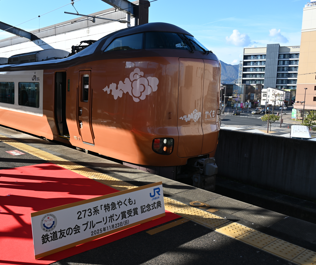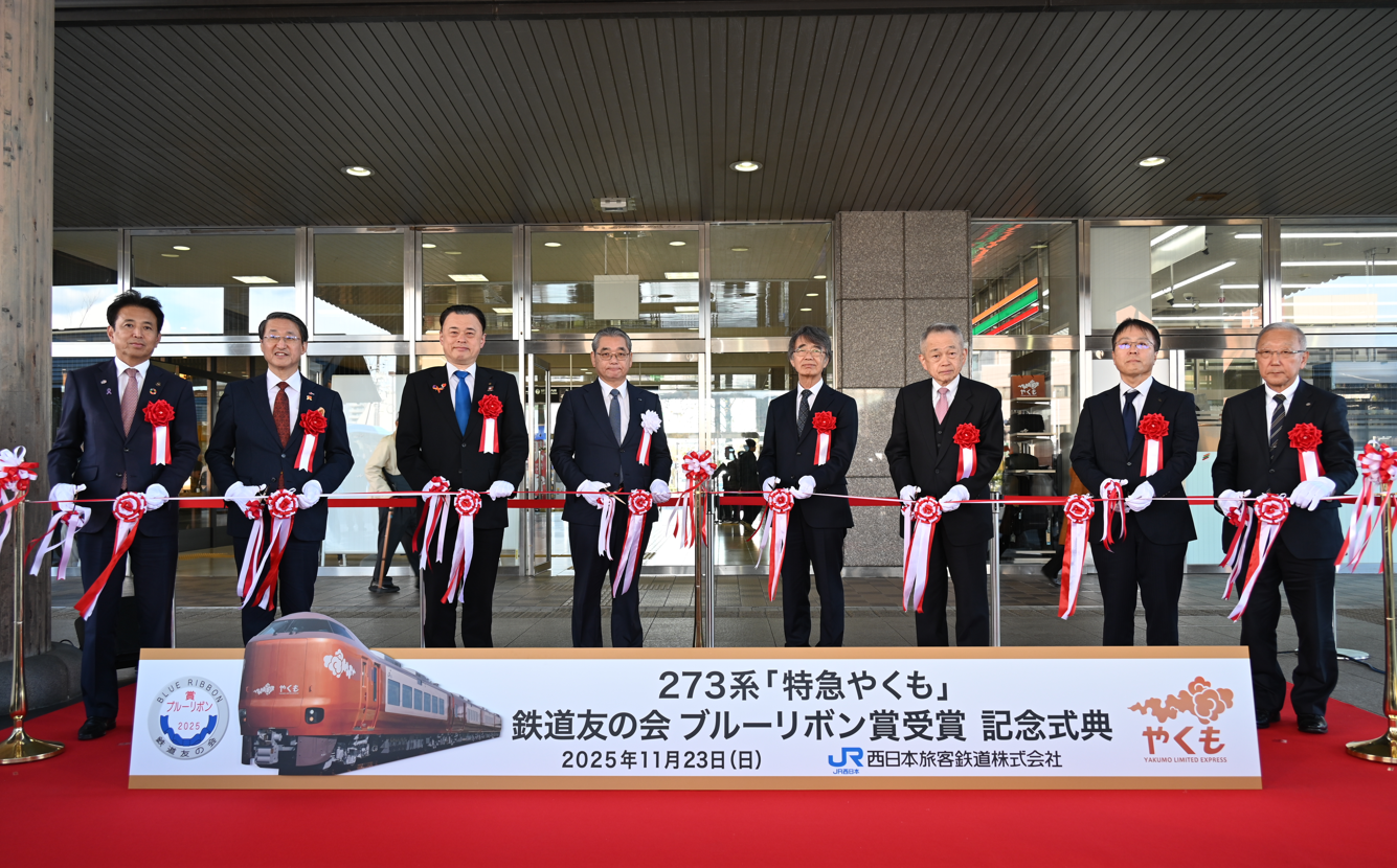2025年11月23日(日)13:30から、JR出雲市駅にて、西日本旅客鉄道 273系車両への2025年鉄道友の会ブルーリボン賞の贈呈式を開催しました。