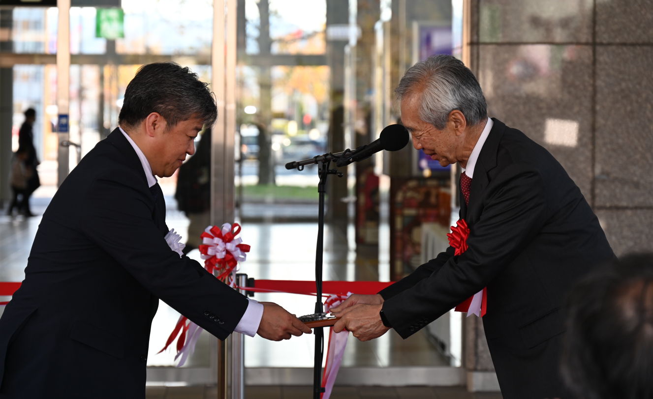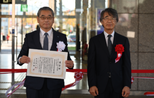 式典では、来賓紹介、佐伯会長の挨拶に続いて、島根県知事 丸山 達也様・鳥取県知事 平井 伸治様の来賓祝辞、尾藤選考委員長により選考経過の紹介が行われました。その後、表彰状が佐伯会長から西日本旅客鉄道鉄道株式会社 代表取締役社長 倉坂 昇治様へ、記念盾が松田副会長から西日本旅客鉄道株式会社 理事 鉄道本部 車両部長 関谷 賢二様に手渡されました。その後、西日本旅客鉄道鉄道株式会社 代表取締役社長 倉坂 昇治様による受賞者ご挨拶、受賞関係者全員でのテープカット、受賞関係者全員による記念撮影を行い、贈呈式は滞りなく終了しました。