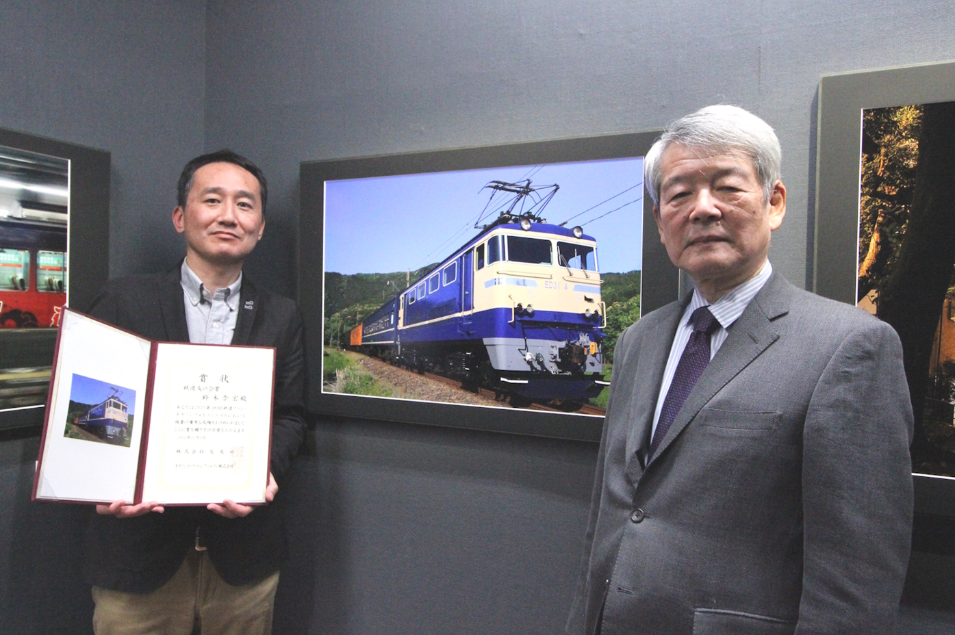 写真:鉄道友の会賞受賞作品の前で、作者の鈴木崇宏さん(左)と日比専務理事(右)